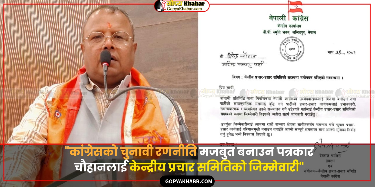 वीरगन्ज- नेपाली कांग्रेसले आसन्न निर्वाचनलाई लक्षित गर्दै वरिष्ठ पत्रकार दीपेन्द्र चौहानलाई पार्टीको केन्द्रीय प्रचार–प्रसार समितिको सदस्यमा मनोनयन गरेको छ। ललितपुरस्थित बी.पी. स्मृति भवनमा रहेको पार्टीको केन्द्रीय कार्यालयबाट माघ २९ गते