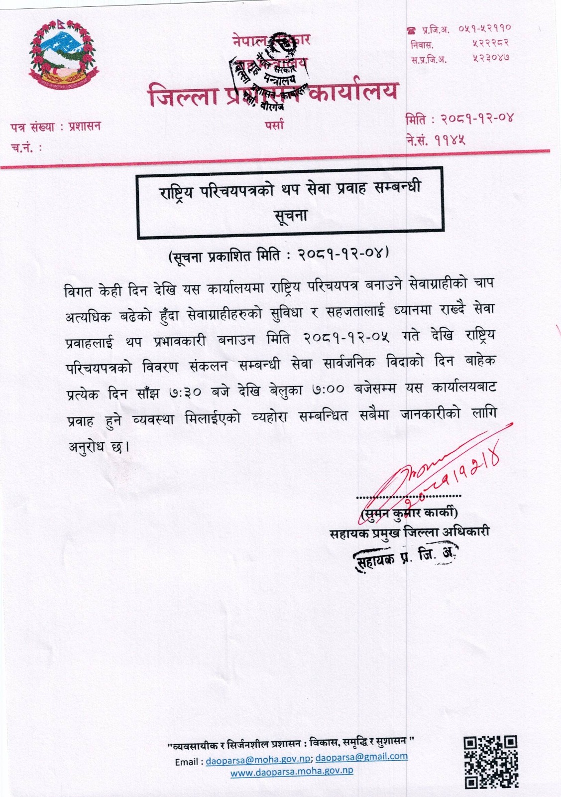 पर्सा जिल्ला प्रशासन कार्यालयद्वारा राष्ट्रिय परिचयपत्र सेवा समय विस्तार