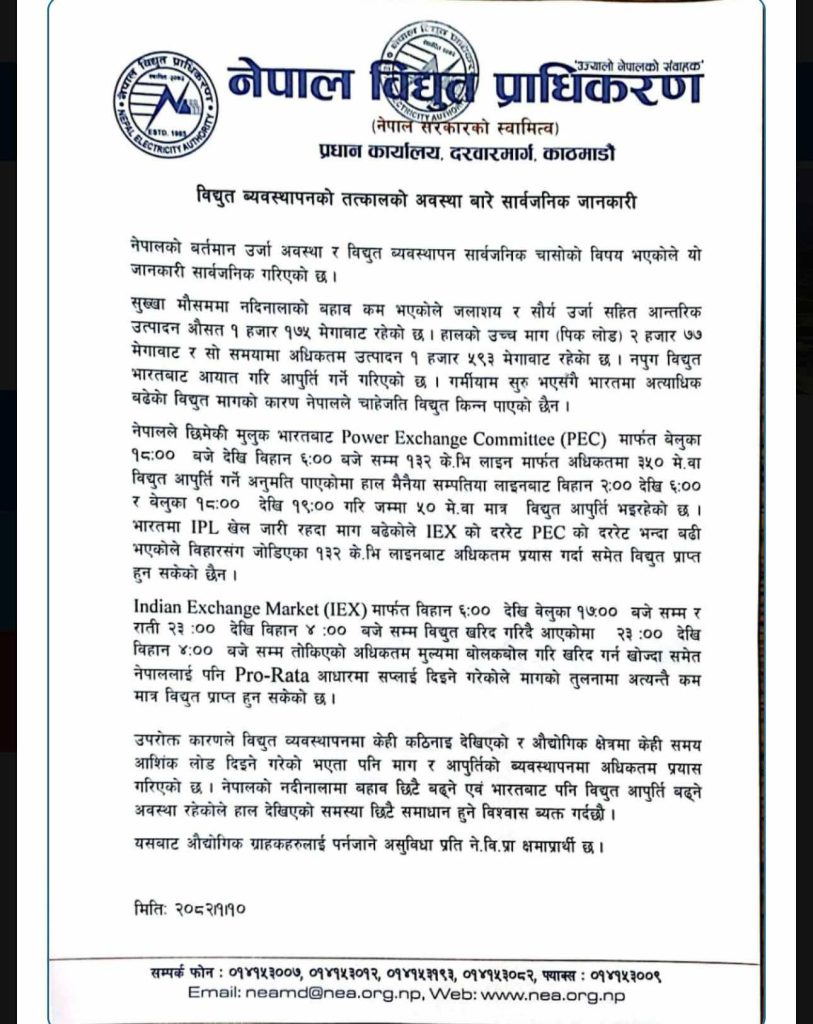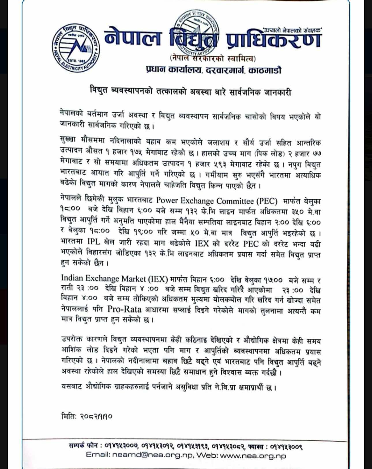 भारतमा जारी आईपीएल क्रिकेट खेलका कारण विद्युतको माग बढेको र इन्डियन इनर्जी एक्सचेन्ज (आईईएक्स) को दररेट पीईसीको दररेटभन्दा बढी भएकाले विहारसँग जोडिएका १३२ केभी लाइनबाट अधिकतम प्रयास गर्दा पनि विद्युत प्राप्त हुन नसकेको प्राधिकरणले जनाएको छ।