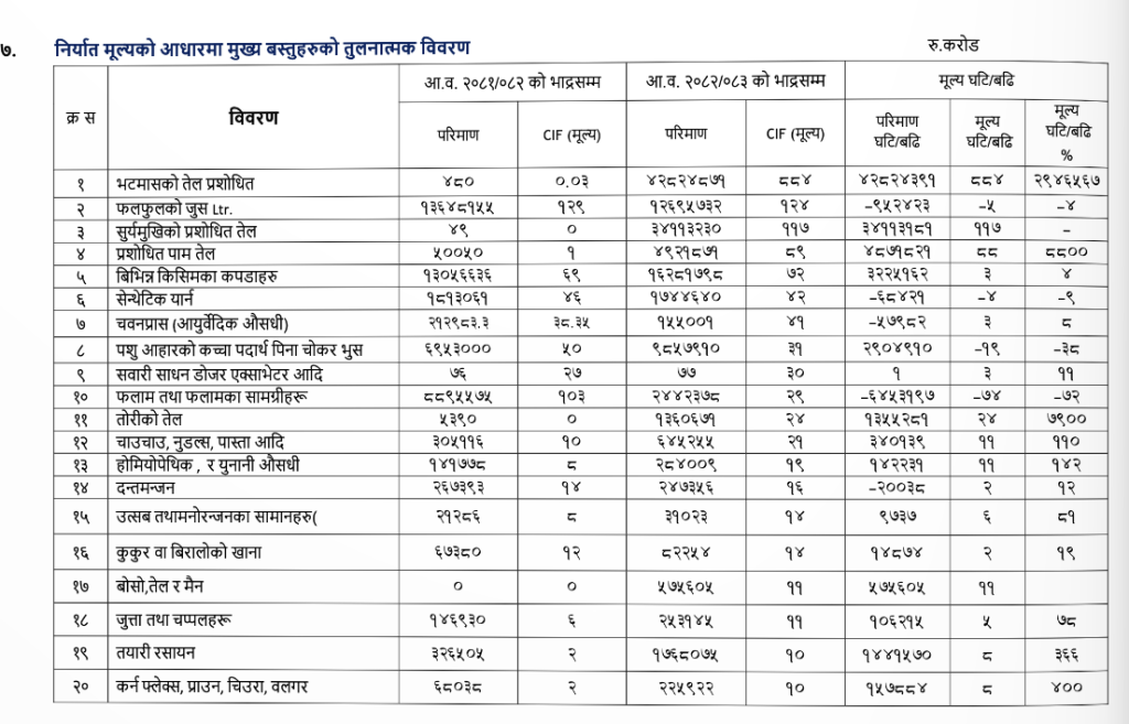 वीरगन्ज नाकामार्फत भारत तथा तेस्रो मुलुकतर्फ विशेषगरी प्रशोधित पाम आयल, सूर्यमुखी र भटमासको प्रशोधित तेल, विभिन्न किसिमका कपडा, जुत्ता, फलको जुशलगायतका वस्तुको निर्यातमा वृद्धि भएको भन्सार कार्यालयका सूचना अधिकारी लेखनाथ पोखरेलले जानकारी दिनुभयो।