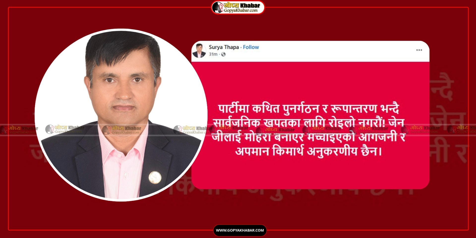 थापाले यस्तो गतिविधि अनुकरणीय नभएको उल्लेख गर्दै नेतृत्वप्रति पनि अप्रत्यक्ष रूपमा असन्तुष्टि जनाएका छन् ।