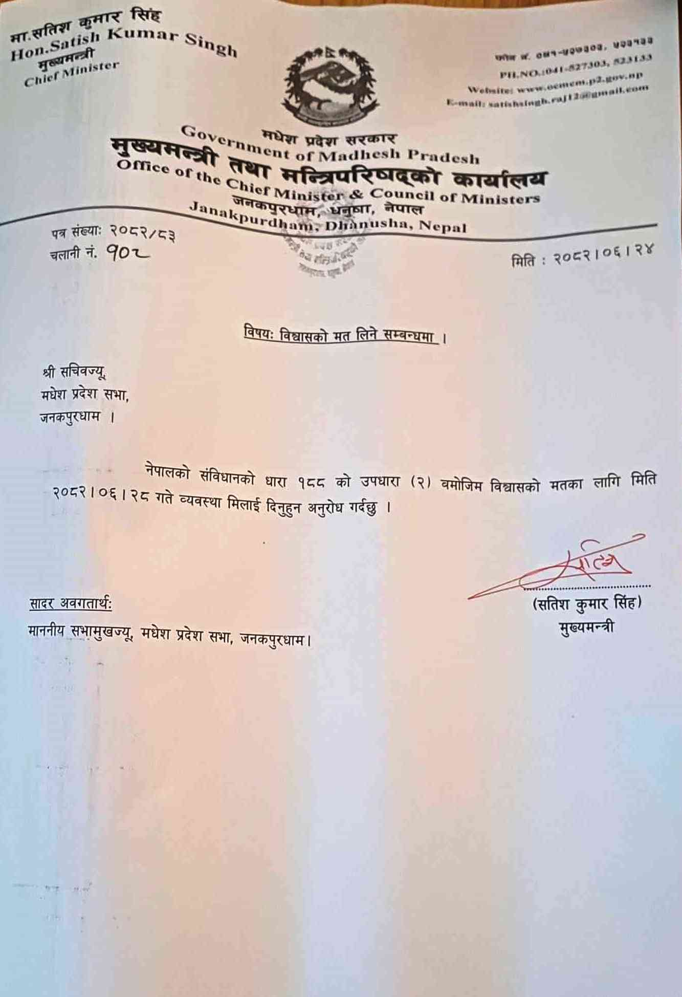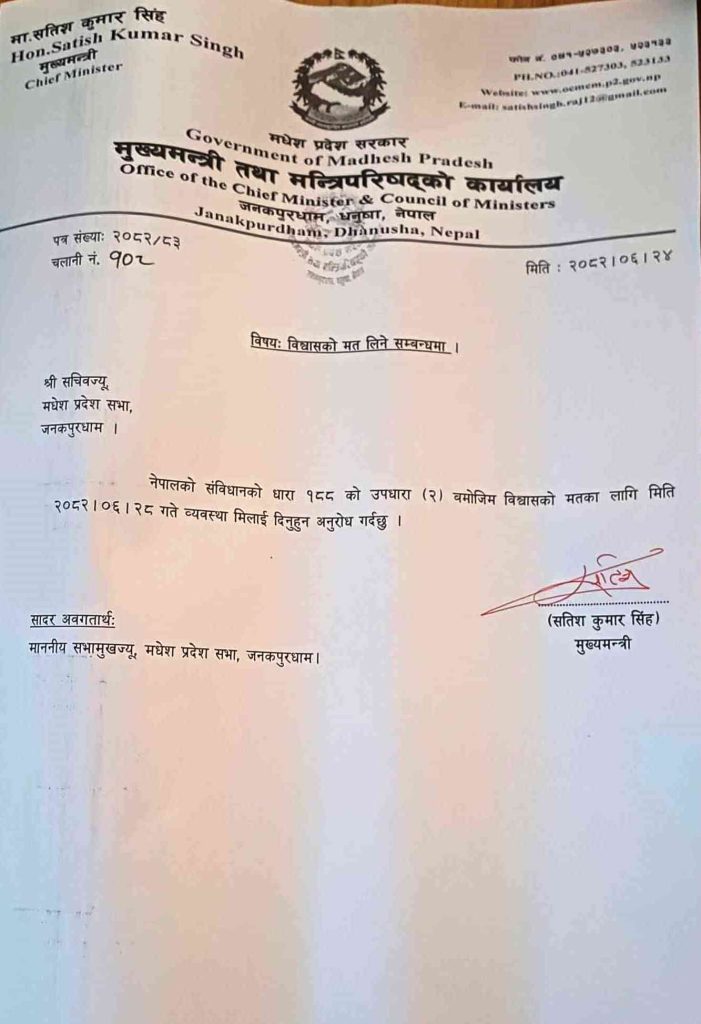मुख्यमन्त्री सिंहले नेपाल संविधानको धारा १८८ को उपधारा (९) बमोजिम विश्वासको मतका लागि मिति निर्धारण गरी दिन प्रदेश सभामा पत्र पठाएका छन्।