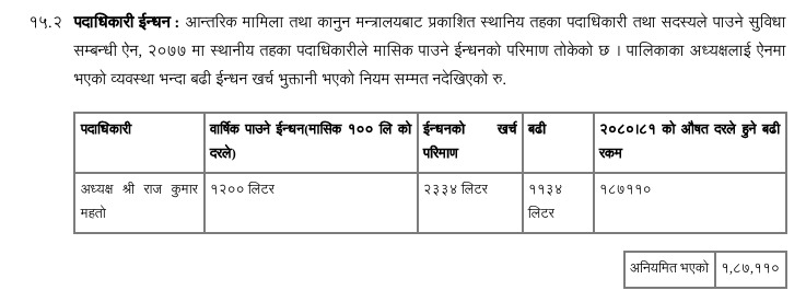 आन्तरिक मामिला तथा कानुन मन्त्रालयबाट प्रकाशित उक्त ऐनमा स्थानीय तहका पदाधिकारीहरूले मासिक रूपमा पाउने ईन्धनको परिमाण स्पष्ट रूपमा तोकिएको छ। ऐनअनुसार, गाउँपालिका अध्यक्षले वार्षिक १,२०० लिटर (मासिक १०० लिटर) ईन्धन पाउने व्यवस्था छ।