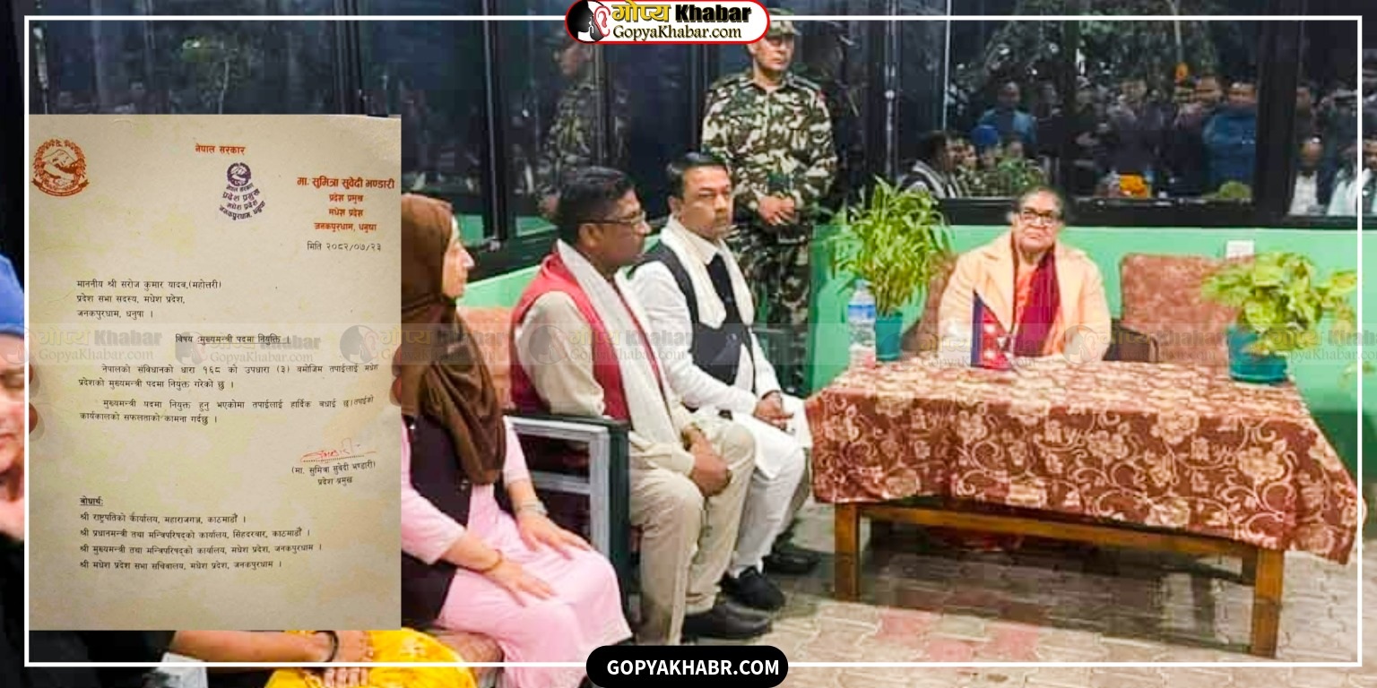मधेश प्रदेशकी प्रमुख सुमित्रा सुवेदी भण्डारीले नेकपा एमालेका संसदीय दलका नेता सरोज यादवलाई सोमबार बिहान मुख्यमन्त्रीको रूपमा शपथ गराएकी छन्।