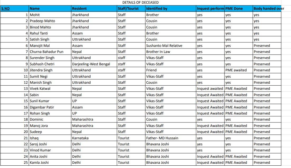गावा सरकारले सार्वजनिक गरेको मृतकहरुको सुचिमा नेपालका चुर्णबहादुर पुन, विवेक कटवाल तथा सविन र सुदीप छन् । उनीहरु नेपालका भनिए पनि ठेगाना खुलेको भारतीय संचारमाध्यमहरुले जनाएका छन् । गोवा सरकारले मृतक नेपाली नागरिकको शव नेपाल पठाउने तयारी गरिरहेको हिन्दूस्तान टाइम्सले जनाएको छ ।