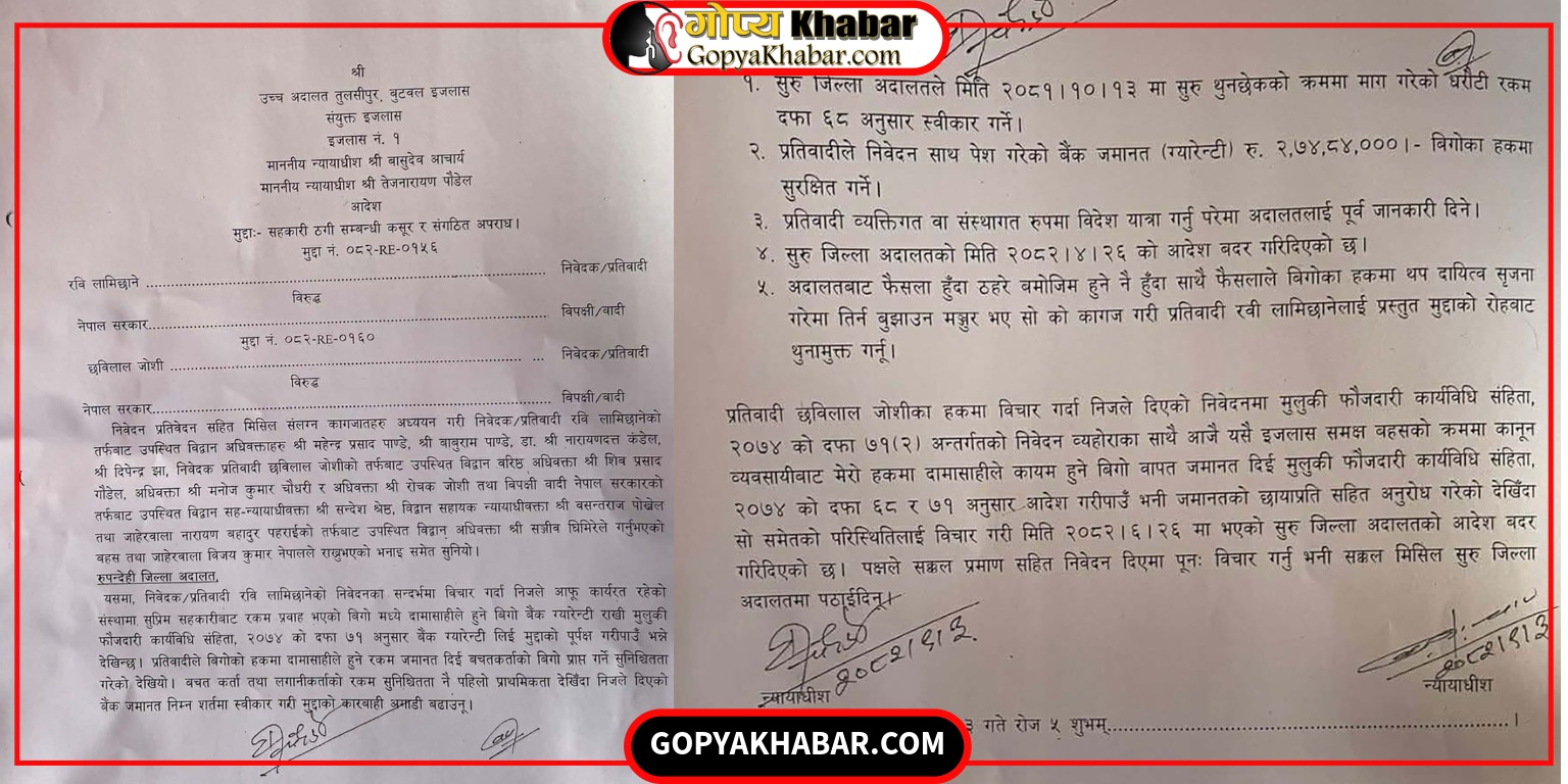 बुटवलको सुप्रिम सहकारी ठगीको मुद्दामा पुर्पक्षका लागि थुनामा रहेका लामिछानेले सहकारीमा अपचलन गरेको आफ्नो भागको बिगो रकम दाखिल गर्दा पनि जिल्ला अदालतका रुपन्देहीका न्यायाधीश नारायण सापकोटाको इजलासले साउन २६ रुपन्देहीले रिहा गर्न अस्वीकार गरेको थियो ।