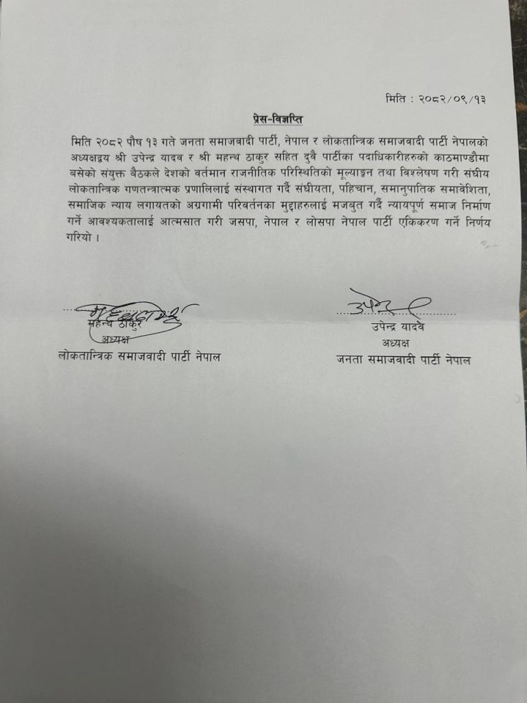 जनता समाजवादी पार्टी (जसपा) नेपाल र लोकतान्त्रिक समाजवादी पार्टी (लोसपा) नेपालले पार्टी एकीकरण गर्ने निर्णय गरेका छन् ।