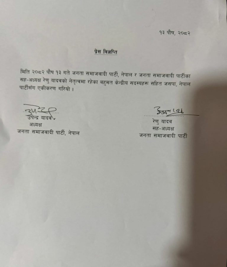 पार्टी एकताका लागि भएको सहमतिपत्रमा जसपा नेपालका अध्यक्ष उपेन्द्र यादव र जसपाकी सहअध्यक्ष रेणु यादवले हस्ताक्षर गरेका छन्। सहमतिपत्रमा भनिएको छ, ‘मिति २०८२ पुस १३ गते जनता समाजवादी पार्टी, नेपाल र जनता समाजवादी पार्टीका सह-अध्यक्ष रेणु यादवको नेतृत्वमा रहेका बहुमत केन्द्रीय सदस्यहरू सहित जसपा, नेपाल पार्टीसँग एकीकरण गरियो।’