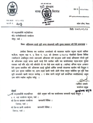 गुठी संस्थान शाखा कार्यालय वीरगन्जकी प्रमुख उर्मिला आचार्यले एक पत्र जारी गर्दै महुवन मठको कित्ता नम्बर २७६ मा रहेको ५ बिघा १७ कट्ठा १४ धुर जग्गामा निर्मित सबै अनधिकृत घर र टहराहरू ७ दिनभित्र हटाउन अन्तिम आदेश दिएकी छिन् । लामो समयदेखि अतिक्रमणकारीको कब्जामा रहेको सो जग्गा खाली गराउन गुठीले यसपटक कुनै पनि दबाब र प्रभावमा नपर्ने सङ्केत दिएको छ ।