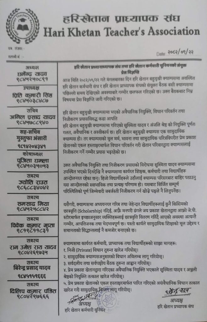 सामुदायिक सम्पत्तिमाथि खेतान परिवारको गिद्धे नजर हरि खेतान प्राध्यापक संघ र कर्मचारी युनियनले जारी गरेको विज्ञप्तिले क्याम्पसभित्रको भयानक बेथितिको पर्दाफास गरेको छ। प्रेम प्रकाश खेतानले एकल हस्ताक्षरको भरमा क्याम्पसको विधान नै बदलेर यसलाई आफ्नो ‘प्राइभेट कम्पनी’ बनाउन खोजेको आरोप शिक्षकहरूको छ। वर्षौँदेखि पसिना बगाएका शिक्षकहरूलाई पाखा लगाएर ‘फेक’ नियुक्ति र विधान संशोधनको खेल खेल्नुले क्याम्पसको भविष्य नै अन्धकारमा धकेलिएको छ।