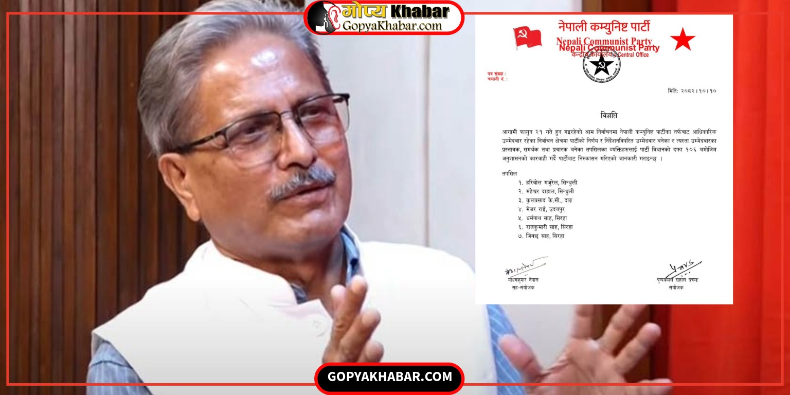 नेपाली कम्युनिस्ट पार्टी (नेकपा) नेता हरिबोल गजुरेलसहित ७ जना नेता पार्टीबाट निष्कासित भएका छन्। पार्टीको आधिकारिक उम्मेवार विरूद्ध बागी उम्मेदवार खडा गरी त्यसको प्रस्तावक र समर्थक बनेको भन्दै गजुरेलसहित ७ जनालाई नेकपाले निष्कासन गरेको हो।