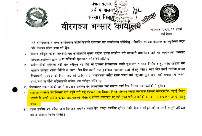 लिलामीको सूचनाको बुँदा नम्बर ९ मा स्पष्ट उल्लेख छ– “सकार गर्नेले आफ्नै खर्चमा सवारी लैजानुअघि नै चेसिस नम्बर र इन्जिन नम्बर मेटाई सवारीलाई दुई टुक्रा पारेर लैजानुपर्नेछ।” तर, भन्सार कर्मचारी र हाकिमको आर्थिक प्रभावमा परी ती सवारी साधनहरूलाई टुक्रा नगरी साबुतै पठाइएको प्रमाण यस अनलाइनसँग सुरक्षित छ।