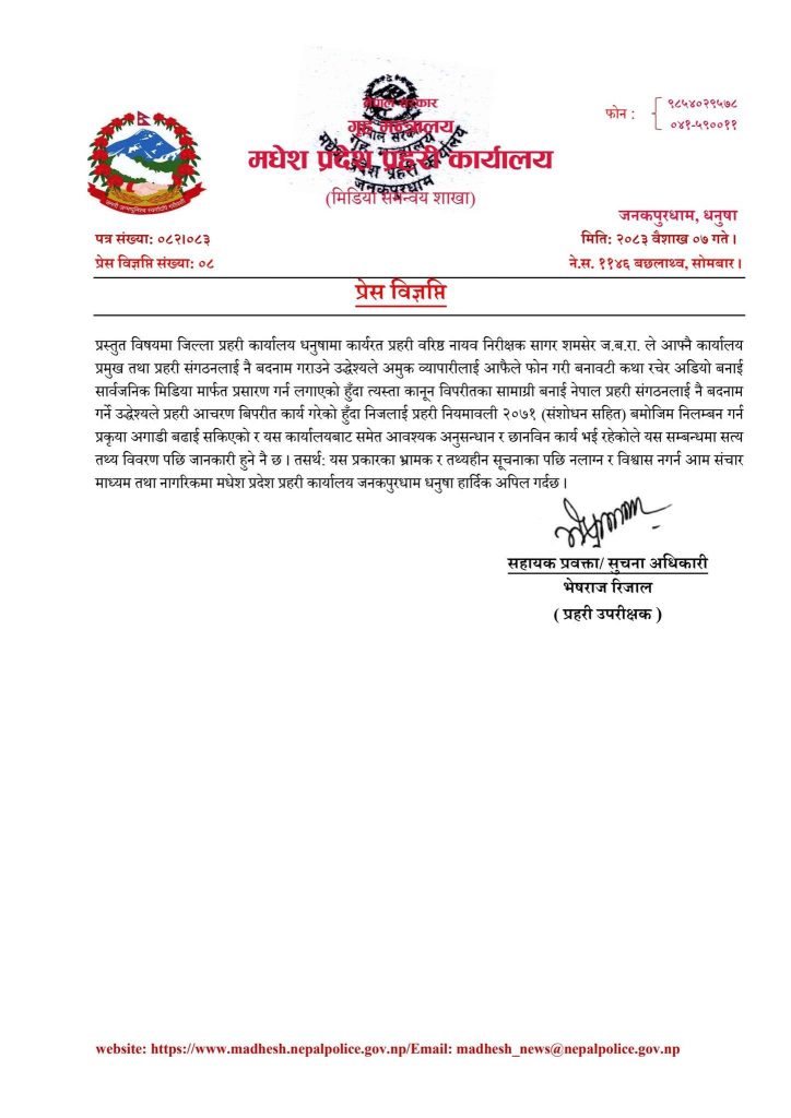 सई राणाले धनुषाका व्यापारीहरूसँग फोन संवाद गरी डिआइजी थपलियाको छवि धमिल्याउने प्रयास गरेको र उक्त संवादका अडियोहरू सञ्चारमाध्यममा पुर्याउन भूमिका खेलेको प्रहरीको दाबी छ। संगठनको मर्यादा विपरित आफ्नै उच्च अधिकारीलाई लक्षित गरी षडयन्त्र बुनेको पाइएपछि मधेस प्रदेश प्रहरी कार्यालयले उनलाई निलम्बनका लागि सिफारिस गरेको छ।