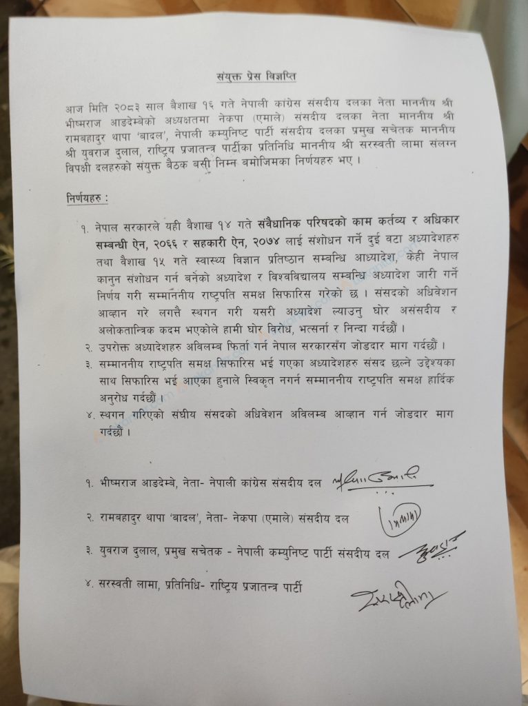 संसद् छलेर अध्यादेश ल्याएको भन्दै विपक्षीको कडा आपत्ति, राष्ट्रपतिलाई स्वीकृत नगर्न आग्रह