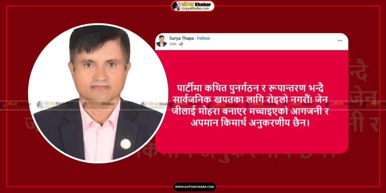काठमाडौं- नेकपा (एमाले)का नेता सूर्य थापाले पार्टीभित्रको कथित पुनर्गठन र रूपान्तरणको नाममा मुलुकमा अराजकता फैलाउने प्रयास भएको आरोप लगाएका छन्
