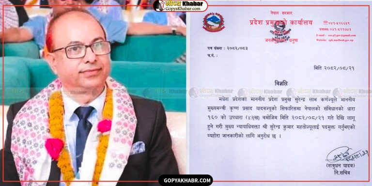 जनकपुर- मधेश प्रदेशका मुख्य न्यायाधिवक्ता सुरेन्द्र कुमार महतो आजबाट पदमुक्त भएका छन् । नवनियुक्त मुख्यमन्त्री कृष्णप्रसाद यादवको सिफारिसमा प्रदेश प्रमुख