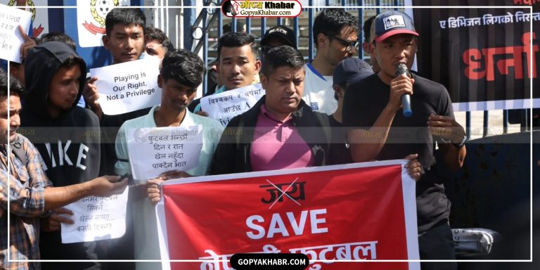 काठमाडौं- नेपाली फुटबलको मेरुदण्ड मानिने शहिद स्मारक ‘ए’ डिभिजन लिग निरन्तर स्थगन भएकाविरुद्ध ललितपुरस्थित एन्फा मुख्यालय अगाडि फुटबल समर्थकहरुले धर्ना