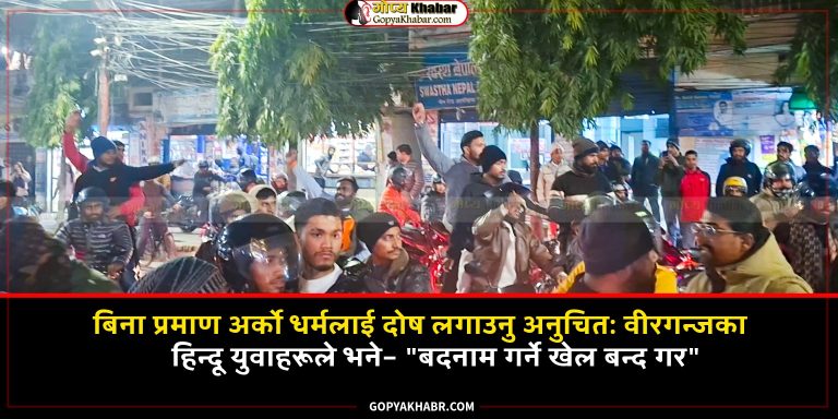 वीरगन्ज- विगत केही दिनदेखि वीरगन्जमा भइरहेका गतिविधि र एक समुदायले अर्को समुदायमाथि लगाएको आरोपको विरोधमा हिन्दू युवाहरूले आइतबार वीरगन्जमा मोटरसाइकल