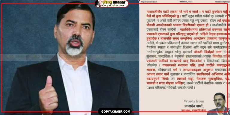 काठमाडौं- नेकपा माओवादी केन्द्रका नेता जनार्दन शर्मा ‘प्रभाकर’ ले स्वार्थको राजनीतिमा सहभागि भई गल्ति गरेको भन्दै कमजोरीलाई स्विकार गरि नयाँ