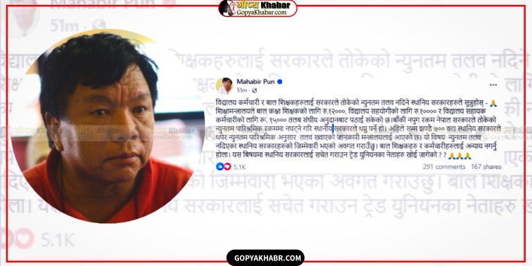 काठमाडौं – शिक्षा, विज्ञान तथा प्रविधि मन्त्री महावीर पुनले स्थानिय सरकारहरुलाई विद्यालय कर्मचारी र बाल शिक्षकहरुलाई सरकारले तोकेको न्युनतम तलव