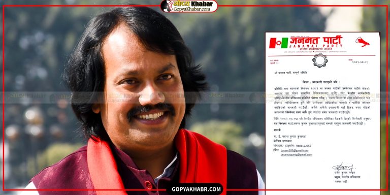 वीरगन्ज- जनमत पार्टीले आगामी प्रतिनिधिसभा निर्वाचनका लागि प्रत्यक्षतर्फ उम्मेदवार बन्न चाहने व्यक्तिले निर्वाचन आयोगले तोकेको सीमाभित्र कम्तीमा ३० देखि ३५