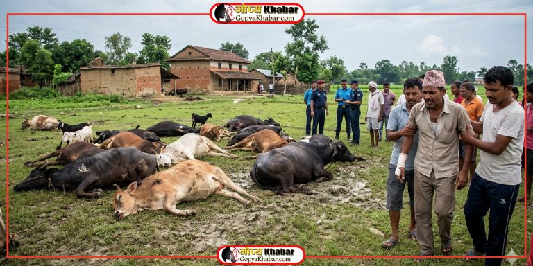 सर्लाही – सर्लाहीको धनकौल गाउँपालिका–४ मैनाथपुर पकाहा टोलमा चट्याङले लागेर १४ पशु चौपायाको मृत्यु भएको हुनुकासाथै एक जना मानिस घाईते